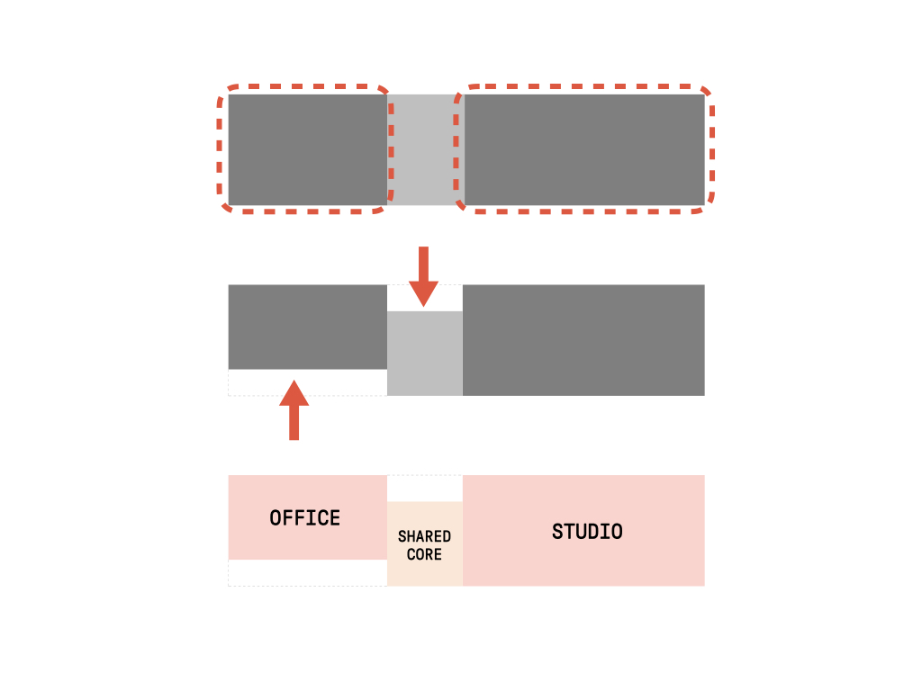 The main entry is located in the center of the building, allowing for a central core that can service the two main spaces. For future flexibility, these two spaces may accomodate separate tenants. The exterior front entry court and building setback respond to the face of the adjacent library and library entrance allowing for code compliant windows and southern light.